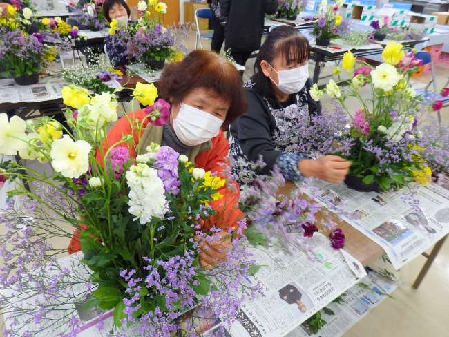 教室は地元産花きの消費拡大を目的に初めて企画され、生産者たち自らアレンジメントを学びました。