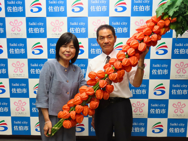 8月6日に、南部エリアほおずき生産部会は佐伯市役所を訪れ、冨高国子佐伯市長にほおずきを贈呈しました。