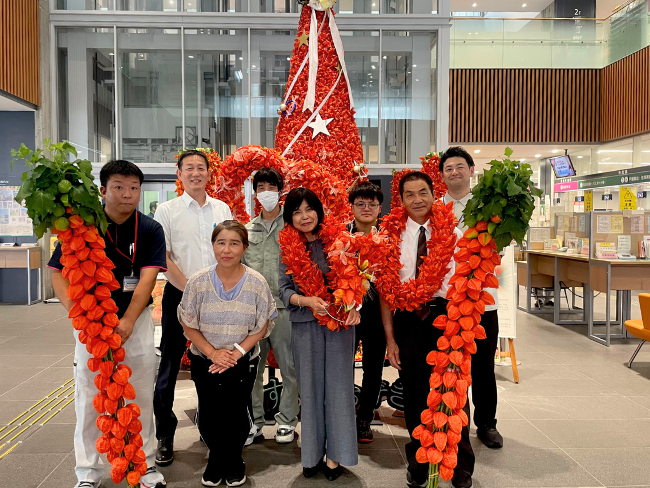 使用されたほおずきは、出荷時に摘み取られる約2万個以上で、生産者から寄贈された後、清望会の利用者によって一つひとつ丁寧にチェックされ、実を取り除いて開き、装飾用として仕上げられました。