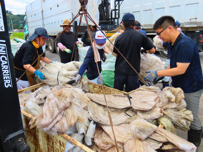 収集会場では、農家が積み込んだトラックが次々と到着。職員らの手際よい作業で廃棄物は山のように積み上げられ、大型トラックに積み込まれました。