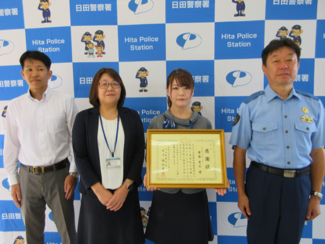 この功績が認められ、9月25日に日田警察署より感謝状が贈呈されました。