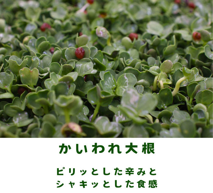 かいわれ大根は、大根の種を発芽させた若い芽を食べる野菜。双葉が貝殻のように開く姿に似ていることから「貝割れ」と名付けられました。 大分県内では1軒のみが生産するかいわれ大根。関西方面の市場へも出荷されており、大分から県内外の食卓へ届けられています。 かいわれ大根は、大根の種を発芽させた若い芽を食べる野菜で、ピリッとした辛みとシャキッとした食感が特長。サラダや料理の彩りなど、さまざまな場面で親しまれています。 手軽に栽培できることから、家庭菜園の野菜としても人気があります。