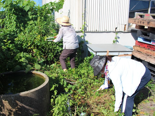 7月28日に、中津女性部は中津市大貞の中津女性部事務所の清掃と周辺の草取り作業を行い、部員10名が参加しました。