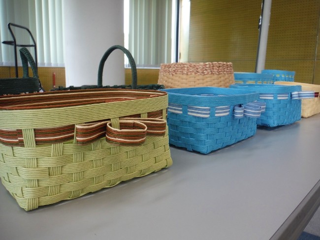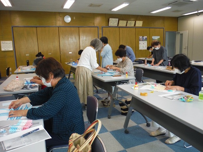 「フレンド教室」では内容を毎回部員らで考案し、今回は米袋の紐にも使われる「エコクラフト」を使い丈夫な小物入れを作成しました。