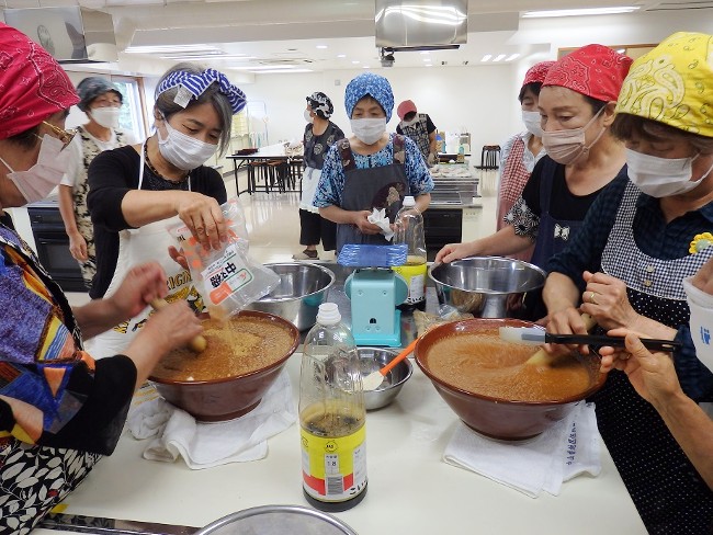 材料に山香産のにんにくや女性部の加工部が作った味噌を使用し、部員同士で混ぜる場面では香りを楽しみ、保存期間について確認しあうなど明るい声で賑わいました。
