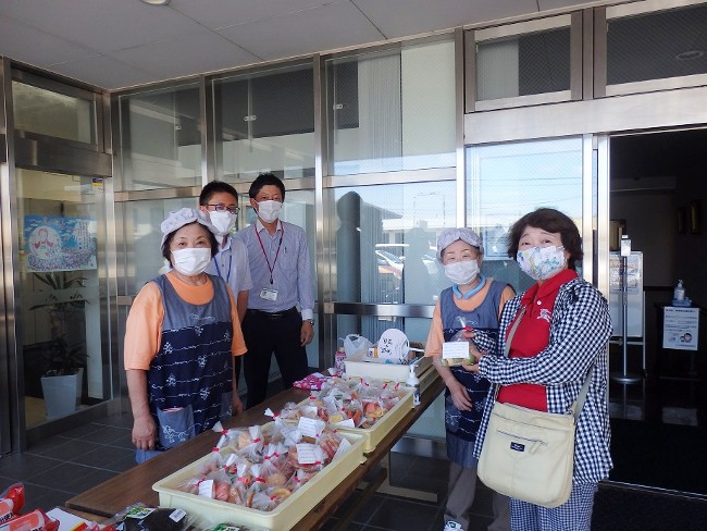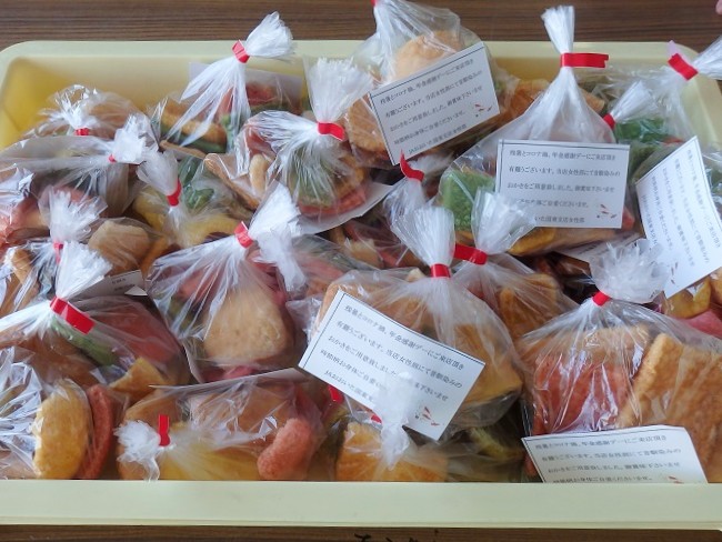 8月15日に、国東女性部国東支部は年金支給日に合わせ、国東支店の来店者へ手作りのおかき(かき餅)をプレゼントしました。