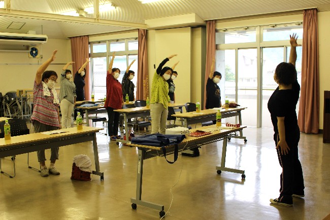 9月26日に、中津女性部は耶馬溪町の下郷地区公民館で健康教室を行いました。 大分県厚生連健康管理センターの三浦美樹保健師を講師に招き、部員12名が参加しました。 健康教室では、座ったままできる運動法や健康改善法を学んだり、血行改善を促進するレインボー体操などを行いました。
