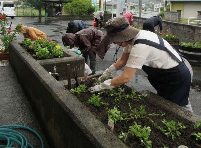 6月22日に、日田女性部は花壇やプランターにマリーゴールド、ペンタス、アンゲロニアなど10種類の花を用意し、西有田公民館の花壇の花植えを行い、役員7名と公民館より1名が参加しました。