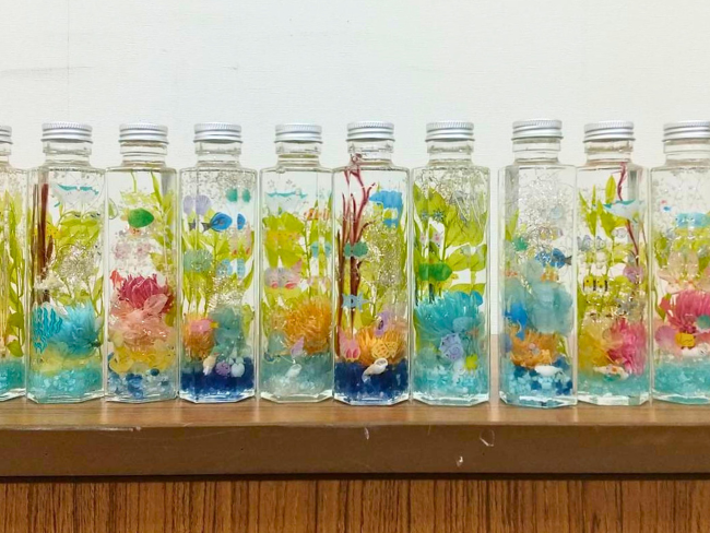 ドライフラワーやビーズなどを瓶に整えながら詰めていき、専用のオイルで満たしました。