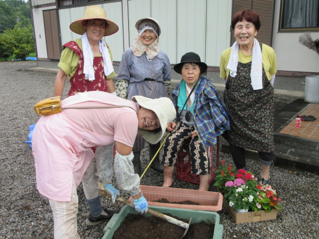 その後、プランターにサルビアなど4種類の花を植え公民館の玄関横に飾りました。