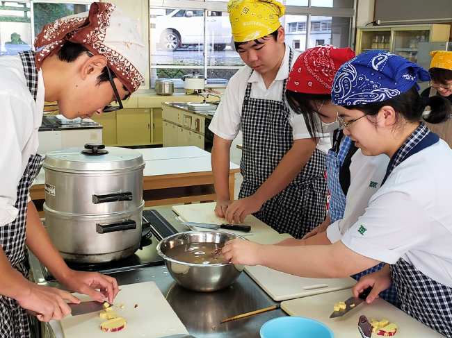 参加した生徒は「汁の多い煮食いは初めて食べました。椎茸が苦手でしたが、だしが出て美味しかったです。今日作った料理を家族にも振舞いたいと思います」「芋もち作りも楽しくて水を一滴も入れないで作るのに驚きました」と話しました。