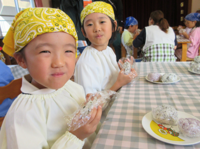 園児らはフレミズ部員に教えてもらいながらおにぎりを握り、丸いおにぎりや三角のおにぎりなど様々な形のおにぎりが完成しました。