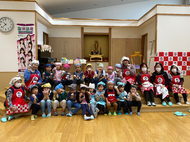 11月11日に、豊後大野女性部は社会福祉法人長清会ももえだこども園でおにぎり教室を開き、園児18名と保育士3名、部員8名が参加しました。