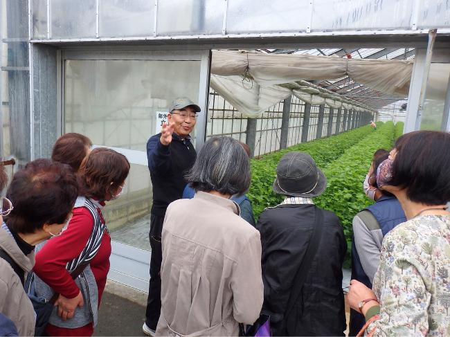 女性部員らは農園で甲斐部会長夫婦による解説を聞きながら、大葉を一枚一枚丁寧に収穫する作業風景や規格ごとにパック詰めを行う様子などをグループに分かれて見学しました。