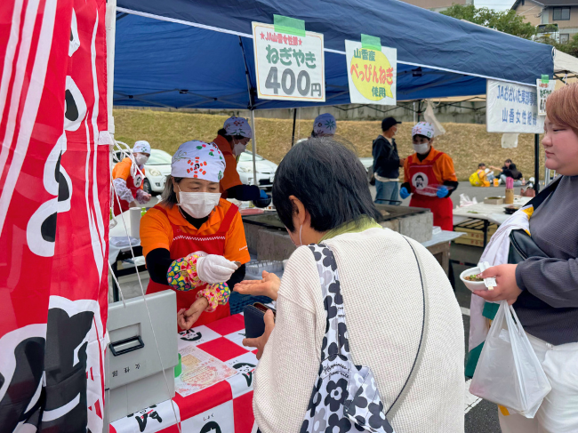 11月9日と10日の2日間に、山香女性部は杵築市山香町で開かれた第37回山香ふるさとまつりへ参加し、特製のねぎ焼きを販売しました。