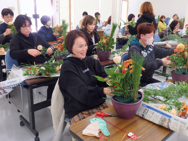 教室では地元のフラワーショップ「玄花」から2名講師を招き、新年を迎える準備として松や菊などを花材にアレンジメントを制作しました。