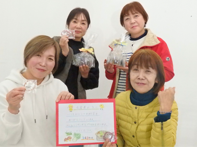 代表して杵築女性部にこども食堂から「生産者の方へいつもおいしいお野菜をありがとうございます」と書かれた感謝状と児童たちの手作りミサンガとプラ板マスコットが贈られました。