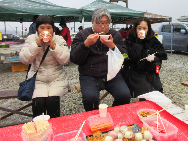 1月11日に、日田女性部は朝市で一年の始まりに感謝を込めて毎年行っている七草がゆの無料配布を行い、来場者の一年の無病息災を願い、部員20名が参加しました。 来場者「やさいのうま味がでて温かく美味しかった」と笑顔で話しました。 川良澄子部長は「幸せや無病息災を願いながら調理しました。七草を食べて一年を元気に過ごしてほしい」と話しました。
