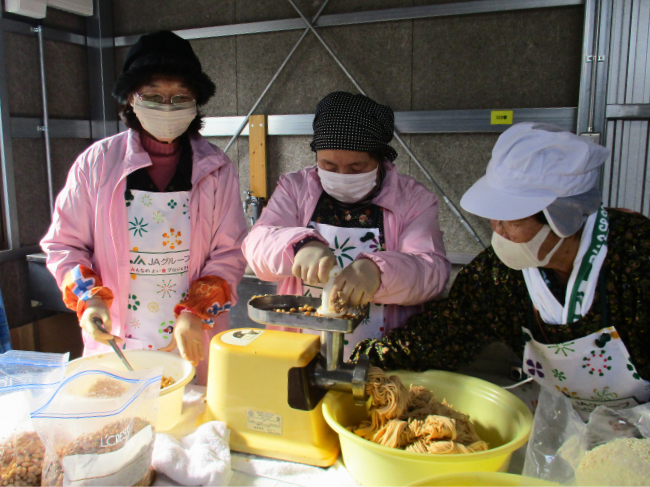 2月3日に、由布女性部は由布市の庄内資材センターで味噌作り教室を開き、部員7名が参加しました。