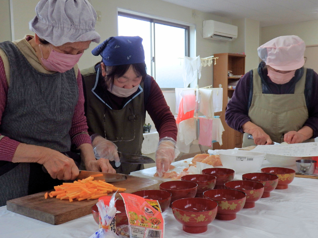 講師は「今持っている筋肉をいかに維持するか、食事を通して学びましょう」と話し、グループに分かれて「鶏肉の南蛮煮」「しめじと小松菜のさっと煮」「キャベツとかにかまのスープ」の3品を調理しました。