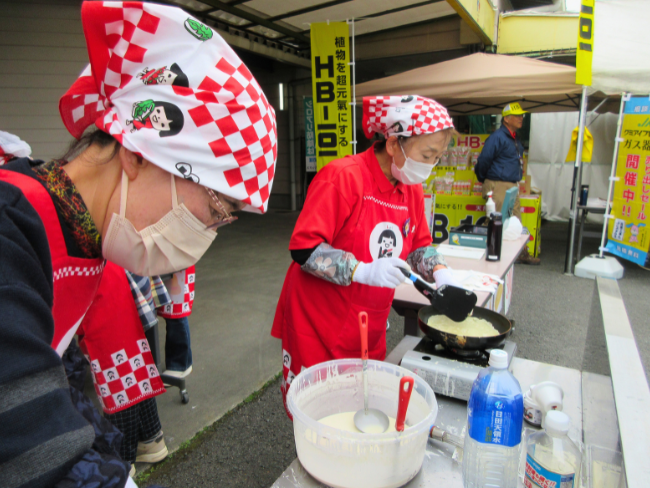 4月12日に、日田女性部は日田グリーンセンター大創業祭で地域貢献活動として部員7名が郷土料理のへこやきの110パック販売をしました。