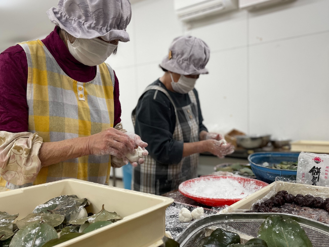 旧暦の端午の節句の時期に柏餅を食べる風習があることから、昨年に引き続き今年も調理と販売を企画。前日から準備を行い、当日は4名の部員が事前予約で受け付けた約500個を作り、パック詰めをして販売しました。