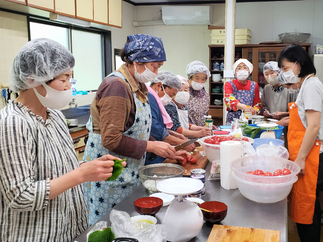 5月15日に、中津女性部は黒水生活改善センターで大分県厚生連健康管理センターの藤井管理栄養士を講師に招き「ラクラク献立料理教室」を開き、部員16名が調理指導を受け昼食を作りました。