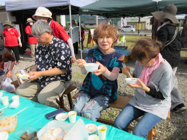 地域住民へ日頃の感謝を込め朝市9周年イベントを行い、女性部による野菜、花、まんじゅう、惣菜の販売、「知っている人から譲ってもらえる気軽なフリーマーケット」も同時に開き洋服、食器、調理器具、日用品などを販売しました。