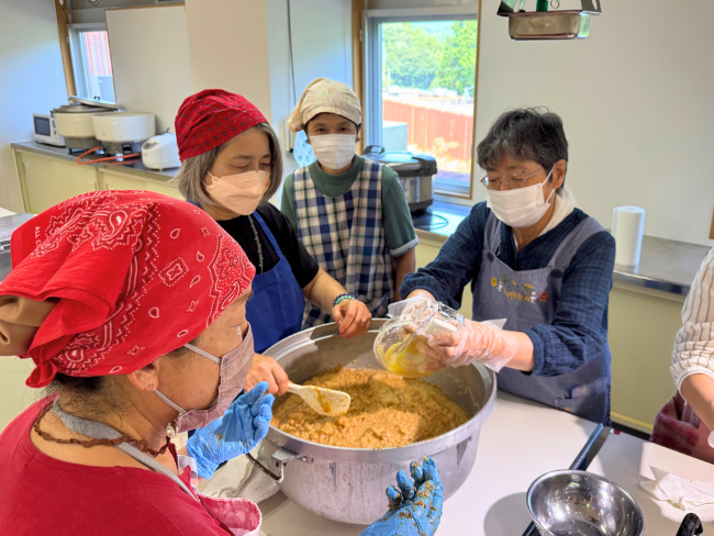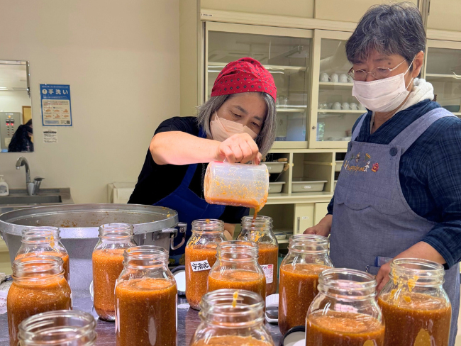 同女性部みそ加工グループが作った「じゅんあい味噌」と部員ら自家製の野菜を持ち寄り、山香女性部オリジナルの「焼肉のたれ」を作りました。