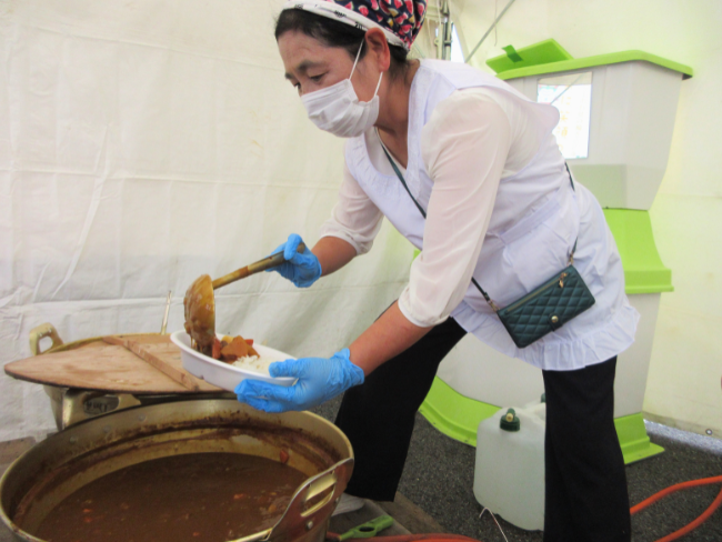 来場者はカレーの美味しそうな匂いに立ち止まり女性部員と語らいながらカレーライスやあんこ餅を購入していました。