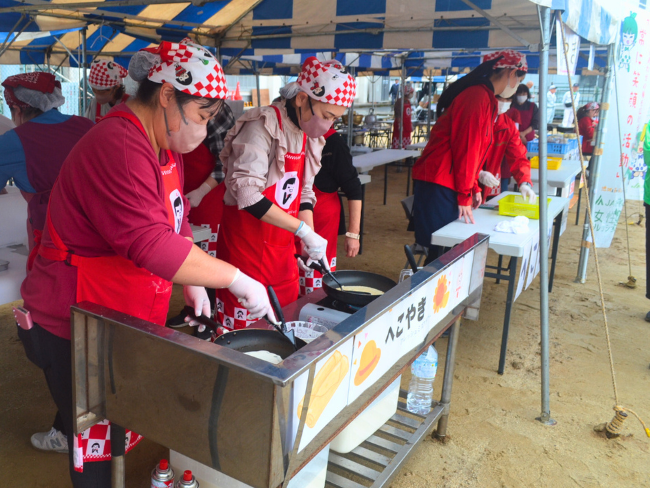 また、フレミズはステージ発表で会場を盛り上げ、日田の郷土菓子へこ焼きを販売しました。