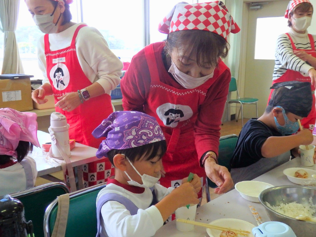 11月17日に、杵築女性部は杵築市立東小学校の1年生と東幼稚園の園児を対象におにぎり教室を開きました。児童と園児15名と女性部員4名が参加しました。