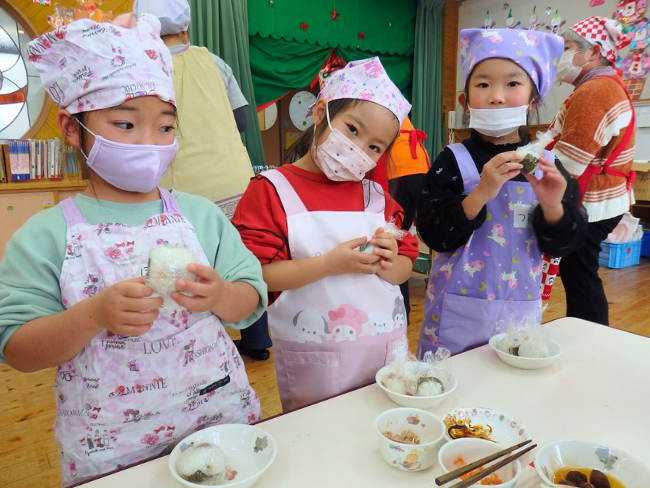 12月11日に、国東女性部は安岐保育所を訪問し「おにぎり教室(JAグループ大分県産米消費拡大事業)」を開き、年長、年中園児30名と女性部員4名、事務局1名が参加しました。
