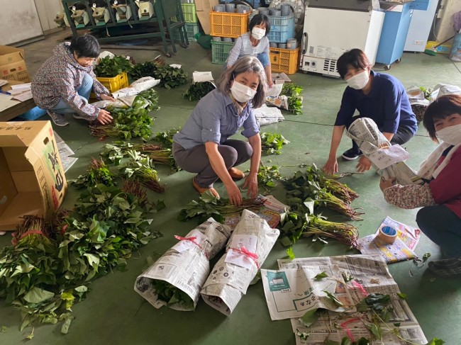 6月3日、山香女性組織は、同組織の部員から注文を取りまとめていたサツマイモの芋づる3500本の配達を行いました。この取り組みは毎年恒例となっており、豊後大野市の業者に注文していた芋づるを女性部事務局が引き取り、持ち帰った芋づるを同組織役員5名で仕分け作業をし、仕分けられたものを各地区の班長が、注文した部員へ配達しました。