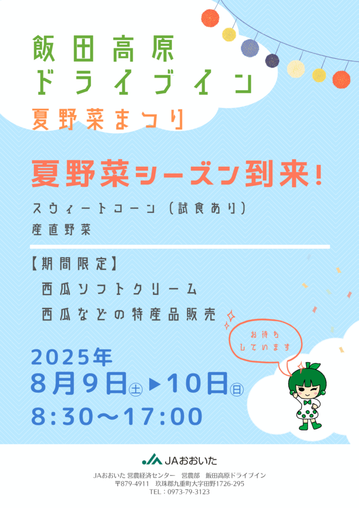 飯田高原ドライブインでは、夏野菜シーズン到来にあわせイベント開催します。ぜひ飯田高原ドライブインへお越しください!高原は涼しいですよ。
