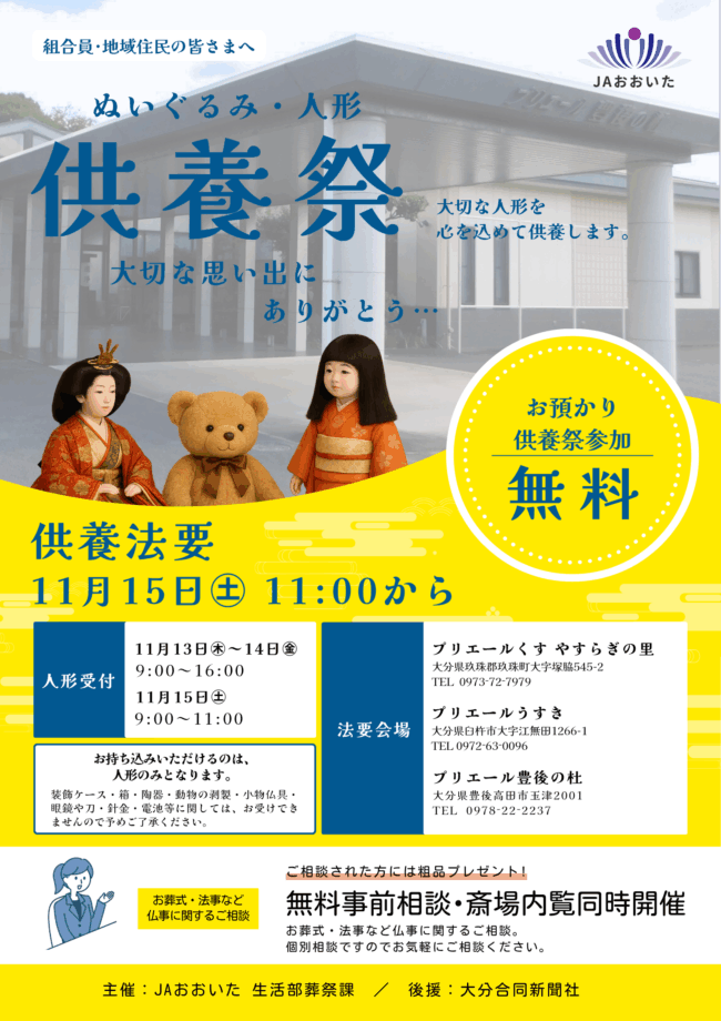 プリエールくす やすらぎの里、プリエールうすき、プリエール豊後の杜の3斎場で人形供養祭を開きます。