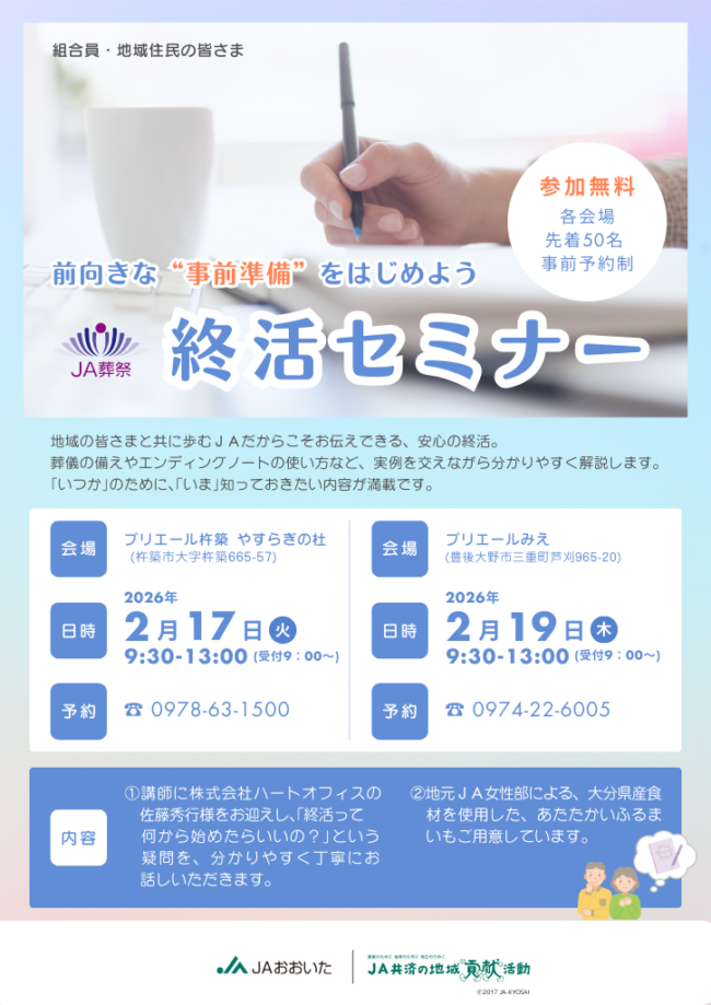 プリエール杵築やすらぎの杜とプリエールみえで、終活セミナーを開催します。 講師とプリエールのスタッフが一緒に「大切な人に伝えたいこと」を考えながら、終活の進め方をわかりやすくご案内します。 当日はエンディングノートのプレゼントもご用意しています。 また、JA女性部による地元食材を使ったお食事のふるまいも行います。 参加費は無料、事前電話予約制で各会場先着50名様となっています。お早めにお申し込みください。